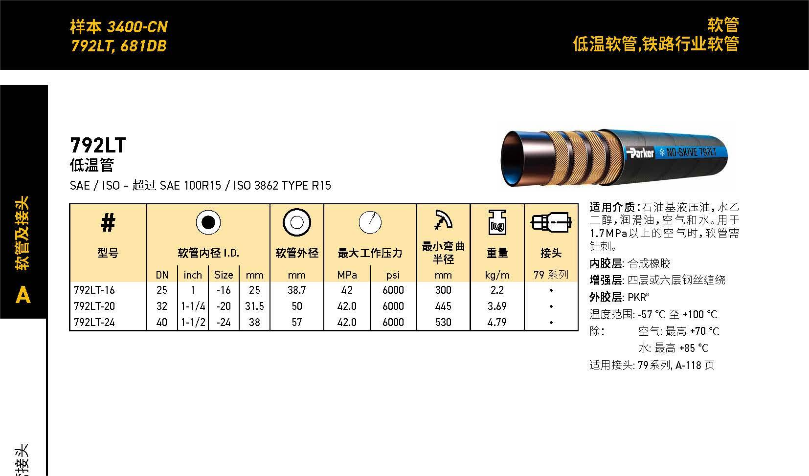適用介質(zhì):石油基液壓油,水乙二醇,潤(rùn)滑油,空氣和水。用于1.7MPa以上的空氣時(shí),軟管需針刺。