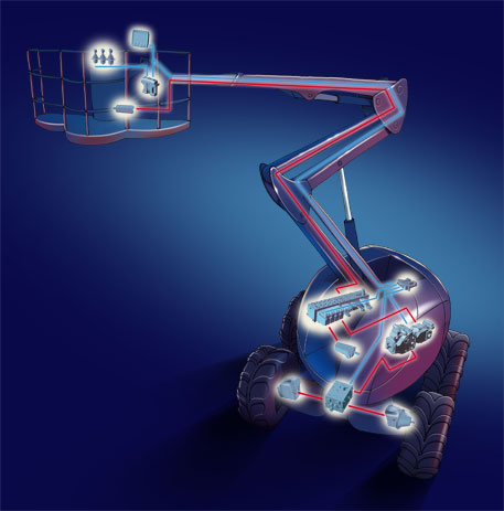 丹佛斯應(yīng)用于高空作業(yè)車上的液壓系統(tǒng)包括:行走泵和馬達(dá),驅(qū)動(dòng)泵,閥及PLUS+1控制器和手柄。還可為機(jī)場用高空作業(yè)車提供L/K馬達(dá)。